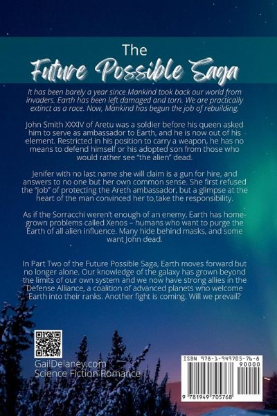 It has barely been a year since Mankind took back our world from invaders. Earth has been left damaged and torn. We are practically extinct as a race. Now, Mankind has begun the job of rebuilding. John Smith XXXIV of Aretu was a soldier before his queen asked him to serve as ambassador to Earth, and he is now out of his element. Restricted in his position to carry a weapon, he has no means to defend himself or his adopted son from those who would rather see "the alien" dead. Jenifer with no last name she'll claim is a gun for hire, and answers to no one but her own common sense. She first refused the "job" of protecting the Areth ambassador, but a glimpse at the heart of the man convinced her to take the responsibility. As if the Sorracchi weren't enough of an enemy, Earth has home-grown problems called Xenos - humans who want to purge the Earth of all alien influence. Many hide behind masks, and some want John dead. In Part Two of the Future Possible Saga, Earth moves forward but no longer alone. Our knowledge of the galaxy has grown beyond the limits of our own system and we now have strong allies in the Defense Alliance, a coalition of advanced planets who welcome Earth into their ranks. Another fight is coming. Will we prevail?