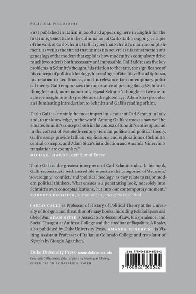First published in Italian in 2008 and appearing here in English for the first time, Janus's Gaze is the culmination of Carlo Galli's ongoing critique of the work of Carl Schmitt. Galli argues that Schmitt's main accomplishment, as well as the thread that unifies his oeuvre, is his construction of a genealogy of the modern that explains how modernity's compulsory drive to achieve order is both necessary and impossible. Galli addresses five key problems in Schmitt's thought: his relation to the state, the significance of his concept of political theology, his readings of Machiavelli and Spinoza, his relation to Leo Strauss, and his relevance for contemporary political theory. Galli emphasizes the importance of passing through Schmitt's thought-and, more important, beyond Schmitt's thought-if we are to achieve insight into the problems of the global age. Adam Sitze provides an illuminating introduction to Schmitt and Galli's reading of him.