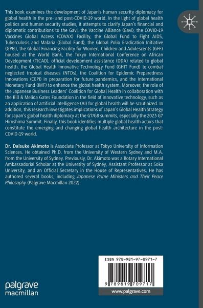 This book examines the development of Japan's human security diplomacy for global health in the pre- and post-COVID-19 world. In the light of global health politics and human security studies, it attempts to clarify Japan's financial and diplomatic contributions to the Gavi, the Vaccine Alliance (Gavi), the COVID-19 Vaccines Global Access (COVAX) Facility, the Global Fund to Fight AIDS, Tuberculosis and Malaria (Global Fund), the Global Polio Eradication Initiative (GPEI), the Tokyo International Conference on African Development (TICAD), official development assistance (ODA) related to global health, the Global Health Innovative Technology Fund (GHIT Fund) to combat neglected tropical diseases (NTDs), the Coalition for Epidemic Preparedness Innovations (CEPI) in preparation for future pandemics, and the International Monetary Fund (IMF) to enhance the global health system. Moreover, the Japanese Business Leaders' Coalition for Global Health in collaboration with the Bill & Melida Gates Foundation in the field of innovative technology, such as an application of artificial intelligence (AI) for global health will be scrutinized. In addition, this research investigates implications of Japan's Global Health Strategy for Japan's global health diplomacy at the event of the G7/G8 summits, especially the 2023 G7 Hiroshima Summit. Finally, this book identifies multiple global health actors that constitute the emerging and changing global health architecture in the post-COVID-19 world.