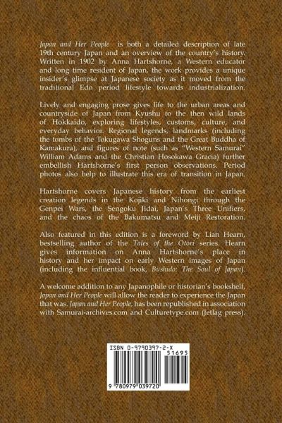 "Japan and Her People" is both a detailed description of late 19th century Japan and an overview of the country's history. Written in 1902 by Anna Hartshorne, a Western educator and long time resident of Japan, the work provides a unique insider's glimpse at Japanese society as it moved from the traditional Edo period lifestyle towards industrialization. Lively and engaging prose gives life to the urban areas and countryside of Japan from Kyushu to the then wild lands of Hokkaido, exploring lifestyles, customs, culture, and everyday behavior. Regional legends, landmarks (including the tombs of the Tokugawa Shoguns and the Great Buddha of Kamakura), and figures of note (such as "Western Samurai" William Adams and the Christian Hosokawa Gracia) further embellish Hartshorne's first person observations. Period photos also help to illustrate this era of transition in Japan. Hartshorne covers Japanese history from the earliest creation legends in the Kojiki and Nihongi through the Genpei Wars, the Sengoku Jidai, Japan's Three Unifiers, and the chaos of the Bakumatsu and Meiji Restoration. Also featured in this edition is a foreword by Lian Hearn, bestselling author of the "Tales of the Otori" series. Hearn gives information on Anna Hartshorne's place in history and her impact on early Western images of Japan (including the influential book, "Bushido: The Soul of Japan"). A welcome addition to any Japanophile or historian's bookshelf, "Japan and Her People" will allow the reader to experience the Japan that was. The classic 1902 book written by Anna Hartshorne, "Japan and Her People", has been republished in association with Samurai-archives.com and Culturetype.com (Jetlag press). This new edition includes an introduction by Lian Hearn, author of the Tales of the Otori series.