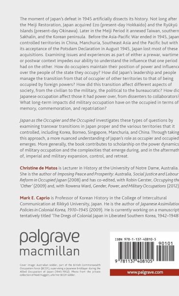 Christine de Matos is Lecturer in History at the University of Notre Dame, Australia. She is the author of Imposing Peace and Prosperity: Australia, social justice and labour reform in occupied Japan (2008) and has co-edited, with Robin Gerster, Occupying the 'Other' (2009) and, with Rowena Ward, Gender, Power, and Military Occupations (2012). Mark E. Caprio is Professor of Korean History in the College of Intercultural Communication at Rikky? University, Japan. He is the author of Japanese Assimilation Policies in Colonial Korea, 1910-1945 (2009). He is currently working on a manuscript tentatively titled 'The Dregs of Colonial Japan in Liberated Southern Korea, 1942-1948'.