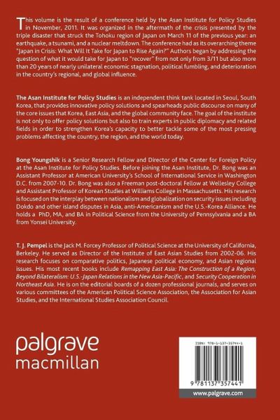 PREFACE - Hahm Chaibong INTRODUCTION - T.J. Pempel PART I: STARTING WITH FUKUSHIMA 1. The Fukushima Nuclear Crisis and Its Political and Social Implications; Masakatsu Ota PART II: THE POLITICAL ECONOMY OF SLOW GROWTH 2. Japan's Economic Crisis: More Chronic than Acute - So Far; Gregory W. Noble 3. Japan's Fiscal Challenge: The Political Economy of Reform; William W. Grimes PART III: HURDLING POLITICAL OBSTACLES 4. Governance Crisis in Japan: Return to the Basic Building Blocks of Democracy; Tetsundo Iwakuni 5. The Ghost of the Second Republic? The Structural Weakness of Parliamentary Bicameralism in Japan; Jun Saito PART IV: TOWARD A MULTICULTURAL SOLUTION? 6. Embracing Asia: Japan's Expat Politics; Kim Mikyoung PART V: IMPROVING RELATIONS WITH THE ASIA-PACIFIC NEIGHBORS 7. What Will It Take for Japan to Rise Again? Vision, Regional Initiative, and Japan-Korea Relations; Kazuhiko Togo 8. Regional Situation Awareness as a Basis for Northeast Asian Regional Cooperation in Dealing with Transnational Nuclear Disasters; Kim Sok Chul 9. The US-Japan Alliance and Japan's Future; Michael Auslin 10. An Economic Step toward Revitalizing Japan and US-Japan Ties; T.J. Pempel INDEX