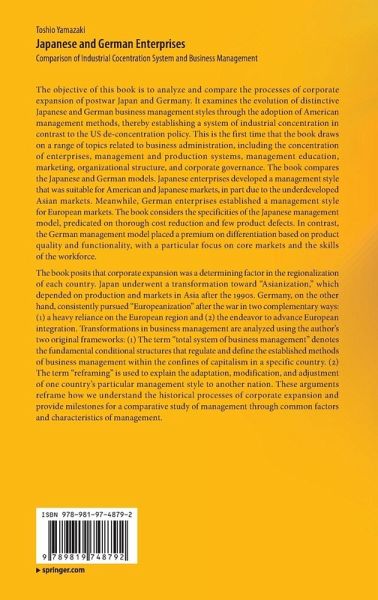Preface.- List of Tables.- List of Figures.- 1. Introduction: Research Topics and Analytical Framework.-Part 1:Total System of Business Management and Characteristics of Management in Japan and German.- 2. Overview of the Total System of Business Management in Postwar Japan and Germany.- 3. Business Management Characteristics in Japan and Germany.- Part 2: System of Postwar Industrial Concentration.- 4. Structures and Functions of Large Corporate Groups.- 5. New Developments of the Industrial System Based on Industry-Bank Relationships.- Part 3: Americanization of Business Management and "Reframing" from the Postwar Period to the Early 1970s.- 6. Deployment of American Management Education.- 7. Deployment of Human Relations.- 8. Deployment of Industrial Engineering.- 9. Deployment of the Ford System.- 10. Deployment of Marketing Methods.- 11. Deployment of a Divisional Structure.- 12. "Reframing" in the Americanization Process and Japanese-Style Managment and German-Style Management from the Postwar Period to the Early 1970s.- Part 4: Business Management in the Periods from the 1970s to the 1980s and after the 1990s.- 13. Development of Mass Production Systems in Japan and Germany during the 1970-1980s and Its Significance.- 14. Transformation toward Shareholder Value-oriented Management and Corporate Governance in Japan and Germany after the 1990s: Resurgence of the Americanization of Business Management.- 15. Conclusion: Significance of Comparative Study of Business Management in Japan and Germany.- Archival sources.- Index.