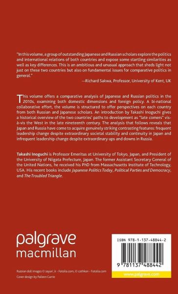 This volume offers a comparative analysis of Japanese and Russian politics in the 2010s, examining both domestic dimensions and foreign policy. A bi-national collaborative effort, the volume is structured to offer perspectives on each country from both Russian and Japanese scholars. An introduction by Takashi Inoguchi gives a historical overview of the two countries' paths to development as 'late comers' vis-à-vis the West in the late nineteenth century. The analysis that follows reveals that Japan and Russia have come to acquire genuinely striking contrasting features: frequent leadership change despite extraordinary societal stability and continuity in Japan and infrequent leadership change despite extraordinary ups and downs in Russia.