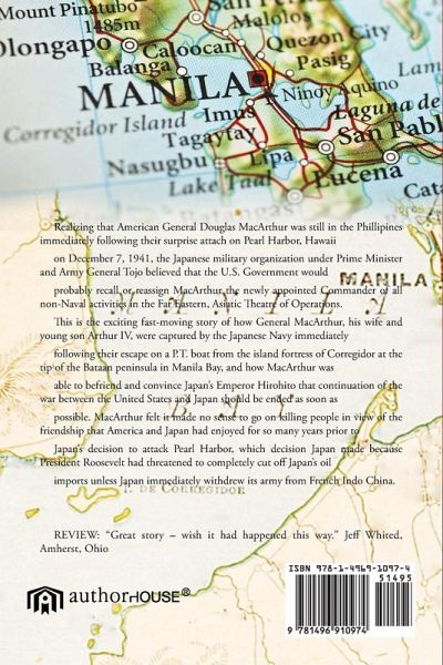 Realizing that American General Douglas MacArthur was still in the Phillipines immediately following their surprise attach on Pearl Harbor, Hawaii on December 7, 1941, the Japanese military organization under Prime Minister and Army General Tojo believed that the U.S. Government would probably recall or reassign MacArthur the newly appointed Commander of all non-Naval activities in the Far Eastern, Asiatic Theatre of Operations. This is the exciting fast-moving story of how General MacArthur, his wife and young son Arthur IV, were captured by the Japanese Navy immediately following their escape on a P.T. boat from the island fortress of Corregidor at the tip of the Bataan peninsula in Manila Bay, and how MacArthur was able to befriend and convince Japan?s Emperor Hirohito that continuation of the war between the United States and Japan should be ended as soon as possible. MacArthur felt it made no sense to go on killing people in view of the friendship that America and Japan had enjoyed for so many years prior to Japan?s decision to attack Pearl Harbor, which decision Japan made because President Roosevelt had threatened to completely cut off Japan?s oil imports unless Japan immediately withdrew its army from French Indo China. REVIEW: ?Great story ? wish it had happened this way.? Jeff Whited, Amherst, Ohio