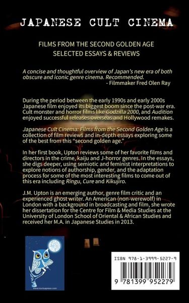 Japanese Cult Cinema: Films from the Second Golden Age is a collection of film reviews and in-depth essays exploring some of the best from the mid-1990s to the early 2000s. During the period between the early 1990s and early 2000s the Japanese film industry enjoyed its biggest boom since the post-war era. Cult monster and horror films like Godzilla 2000, and Audition enjoyed successful releases overseas and Hollywood remakes. In her first book, Upton explores some of her favorite Japanese films and directors in the crime, kaiju and J-horror genres. In the essays, she digs deeper, using semiotic and feminist interpretations to explore notions of authorship, gender, and the adaptation process for some of the most interesting films to come out of this era including Ringu, Cure and Kikujiro.