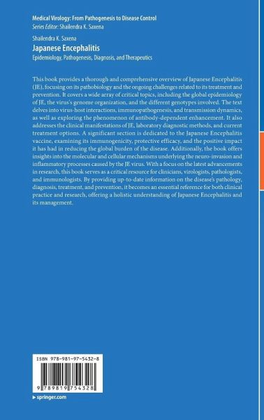 This book provides a comprehensive overview of Japanese Encephalitis (JE), its pathobiology, and associated challenges for treatment and prevention. It focuses on various aspects of Japanese Encephalitis, including global epidemiology, genome organization and genotypes, virus-host interactions, immunopathogenesis, transmission dynamics, antibody-dependent enhancement, clinical characteristics, laboratory diagnosis, treatment, prevention, and control strategies. It provides a brief account of the Japanese encephalitis vaccine, their immunogenicity, protective ability, and impact of JE's vaccine in reducing the burden of the disease. It also helps in understanding the molecular and cellular factors involved in the JE virus neuro-invasion and inflammatory processes. The book uniquely presents cutting-edge information and provides an edited information source for clinicians, virologists, pathologists, and immunologists.