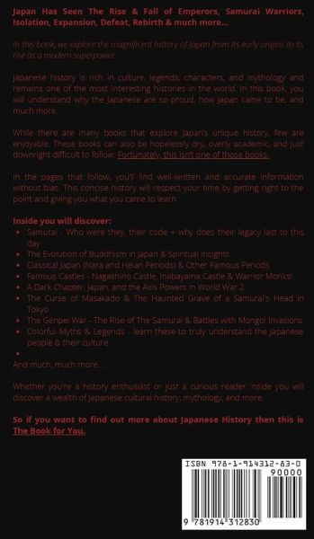 Japan Has Seen The Rise & Fall of Emperors, Samurai Warriors, Isolation, Expansion, Defeat, Rebirth & much more.. In this book we explore the magnificent history of Japan from it's early origins to its rise as a modern super power. Japanese history is rich in culture, legends, characters, mythology and remains one of the most interesting histories in the world. In this book you will understand why the Japanese are so proud, how Japan came to be and much more. While there are many books that explore Japan's unique history, few are enjoyable. These books can also be hopelessly dry, overly academic, and just downright difficult to follow. Fortunately, this isn't one of those books. In the pages that follow, you'll find well written and accurate information without bias. This concise history will respect your time by getting right to the point and giving you what you came to learn. Inside you will discover: Samurai - Who were they, their code + why their legacy lasts to this day The Evolution of Buddhism in Japan & Spiritual Insights Classical Japan (Nara and Heian Periods) & Other Famous Periods Famous Castles - Nagashino Castle, Inabayama Castle & Warrior Monks! A Dark Chapter, Japan and the Axis Powers in World War 2 The Curse of Masakado & The Haunted Grave of a Samurai's Head in Tokyo The Genpei War - The Rise of The Samurai & Battles with Mongol Invasions Colourful Myths & Legends - learn these to truly understand the Japanese people & their culture And much, much more... Whether you're a history enthusiast or just a curious reader..inside you will discover a wealth of Japanese cultural history, mythology and more. So if you want to find out more about Japanese History then this is The Book for You