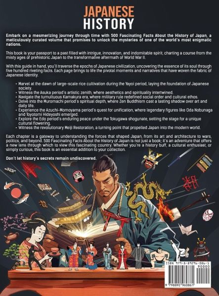 Embark on a mesmerizing journey through time with 500 Fascinating Facts About the History of Japan, a meticulously curated volume that promises to unlock the mysteries of one of the world's most enigmatic nations. This book is your passport to a past filled with intrigue, innovation, and indomitable spirit, charting a course from the misty ages of prehistoric Japan to the transformative aftermath of World War II. With this guide in hand, you'll traverse the epochs of Japanese civilization, uncovering the essence of its soul through five hundred riveting facts. Each page brings to life the pivotal moments and narratives that have woven the fabric of Japanese identity. Marvel at the dawn of large-scale rice cultivation during the Yayoi period, laying the foundation of Japanese society. Witness the Asuka period's artistic zenith, where aesthetics and spirituality intertwined. Navigate the tumultuous Kamakura era, where military rule redefined social order and cultural ethos. Delve into the Muromachi period's spiritual depth, where Zen Buddhism cast a lasting shadow over art and daily life. Experience the Azuchi-Momoyama period's quest for unification, where legendary figures like Oda Nobunaga and Toyotomi Hideyoshi emerged. Explore the Edo period's enduring peace under the Tokugawa shogunate, setting the stage for a unique cultural flowering. Witness the revolutionary Meiji Restoration, a turning point that propelled Japan into the modern world. Each chapter is a gateway to understanding the forces that shaped Japan, from its art and architecture to wars, politics, and beyond. 500 Fascinating Facts About the History of Japan is not just a book; it's an adventure that offers a new lens through which to view this fascinating country. Whether you're a history buff, a cultural enthusiast, or simply curious, this book is an essential addition to your collection.