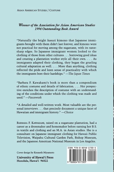Between 1886 and 1924 thousands of Japanese journeyed to Hawaii to work the sugarcane plantations. First the men came, followed by brides, known only from their pictures, for marriages arranged by brokers. This book tells the story of two generations of plantation workers as revealed by the clothing they brought with them and the adaptations they made to it to accommodate the harsh conditions of plantation labor. Barbara Kawakami has created a vivid picture highlighted by little-known facts gleaned from extensive interviews, from study of preserved pieces of clothing and how they were constructed, and from the literature. She shows that as the cloth preferred by the immigrants shifted from kasuri (tie-dyed fabric from Japan) to palaka (heavy cotton cloth woven in a white plaid pattern on a dark blue background) so too their outlooks shifted from those of foreigners to those of Japanese Americans. Chapters on wedding and funeral attire present a cultural history of the life events at which they were worn, and the examination of work, casual, and children's clothing shows us the social fabric of the issei (first-generation Japanese). Changes that occurred in nisei (second-generation) tradition and clothing are also addressed. The book is illustrated with rare photographs of the period from family collections.