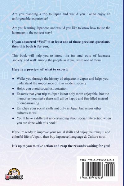 Are you planning a trip to Japan and would you like to enjoy an unforgettable experience? Are you learning Japanese and would you like to know how to use the language in the correct way? If you answered "Yes!" to at least one of those previous questions, then this book is for you! This book will help you to know the ins and outs of Japanese society, and walk among the people as if you were one of them. Here is a preview of what to expect:Walks you through the history of etiquette in Japan and helps you understand the importance of it in modern society Helps you avoid social ostracization Ensures that your trip to Japan is not only more enjoyable, but the memories you make there will all be happy and fun-filled instead of embarrassing Enriches your social skills not only in Japan but across other cultures as well You'll have a different understanding about social interaction when you are done with this book! If you're ready to improve your social skills and enjoy the tranquil and colorful life of Japan, then buy Japanese Language & Culture now. It's up to you to take action and reap the rewards waiting for you!