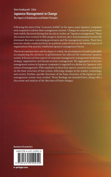 This book examines how, and the degree to which, the development of market principles accompanying the advances of globalization has affected the traditional Japanese system. It focuses on four aspects of corporate management: management institutions, strategy, organization, and human resource management. The aggregation of the new management system in Japanese companies is regarded as a distinctive Japanese-style system of management. With emphasis on these four aspects, research was conducted on the basic structure of that system, following changes in the market,technology, and society. Further, specific functions of the basic structure of the Japanese-style management system were studied. Those findings are included here, along with a discussion and analysis of the direction of future changes.