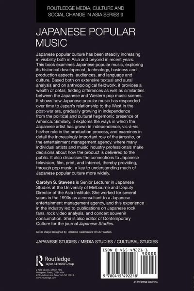 Based both on extensive textual and aural analysis, and on anthropological fieldwork, it provides a wealth of detail, finding differences as well as similarities between the Japanese and Western pop music scenes. Carolyn Stevens shows how Japanese popular music has responded over time to Japan's relationship to the West in the post-war era, gradually growing in independence from the political and cultural hegemonic presence of America. Similarly, the volume explores the ways in which the Japanese artist has grown in independence vis-à-vis his/her role in the production process, and examines in detail the increasingly important role of the jimusho, or the entertainment management agency, where many individual artists and music industry professionals make decisions about how the product is delivered to the public. It also discusses the connections to Japanese television, film, print and internet, thereby providing through pop music a key to understanding much of Japanese popular culture more widely.