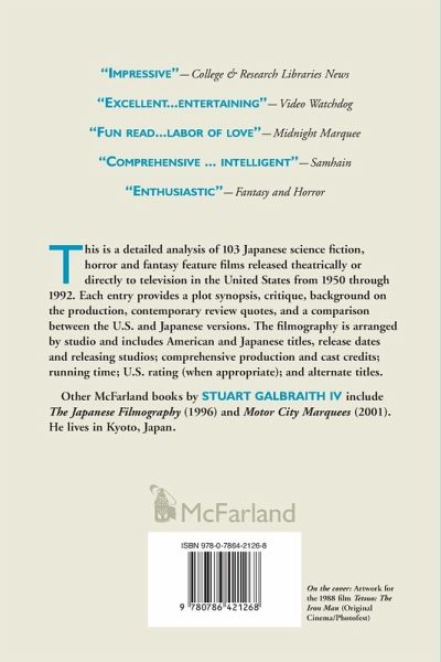 This is a detailed analysis of 103 Japanese science fiction, horror and fantasy feature films released theatrically or directly to television in the United States from 1950 through 1992. Each entry provides a plot synopsis, critique, background on the production, contemporary review quotes, and a comparison between the U.S. and Japanese versions. The filmography is arranged by studio and includes American and Japanese titles, release dates and releasing studios; comprehensive production and cast credits; running time; U.S. rating (when appropriate); and alternate titles.