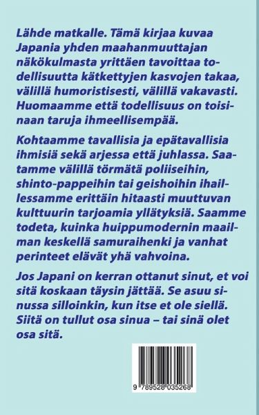 Japani on monikasvoinen maa, jota on mahdotonta kuvata kattavasti ja yksikäsitteisesti. Jokaisella meistä on varmasti mielikuva japanilaisista ja nousevan auringon maasta, mutta tuskin tiedämme paljoakaan todellisuudesta. Tämä kirja kuvaa Japania yhden maahanmuuttajan näkökulmasta yrittäen tavoittaa todellisuutta kätkettyjen kasvojen takaa, välillä humoristisesti, välillä vakavasti. Lähde siis matkalle. Huomaamme että todellisuus on toisinaan taruja ihmeellisempää. Kohtaamme tavallisia ihmisiä sekä arjessa että juhlassa. Saatamme välillä törmätä poliiseihin, shintopappeihin tai geishoihin ihaillessamme tämän erittäin hitaasti muuttuvan kulttuurin tarjoamia yllätyksiä. Saamme todeta, kuinka huippumodernin maailman keskellä samuraihenki ja vanhat perinteet elävät yhä vahvoina. Jos Japani on kerran ottanut sinut, et voi sitä koskaan täysin jättää. Se asuu sinussa silloinkin, kun itse et ole siellä. Siitä on tullut osa sinua - tai sinä olet osa sitä.