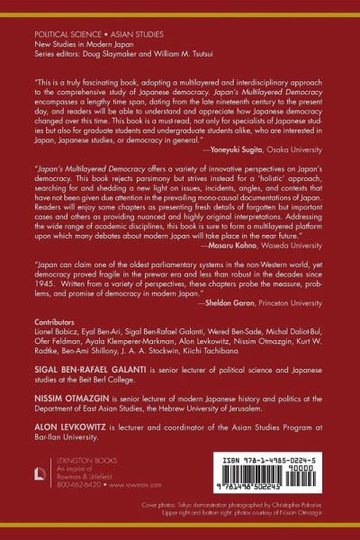 Chapter 1: "Introduction: Japan as a Multilayered Democracy," Nissim Otmazgin, Sigal Ben-Rafael Galanti, and Alon Levkowitz Part I: Pre-war Sources of Japanese Democracy Chapter 2: "11 February 1889: Japan's First Constitution," Lionel Babicz Chapter 3: "Is Taisho Demokurashi the Same as Taisho Democracy?" Kiichi Tachibana Chapter 4: "The making of private and public space in Meiji Japan," Kurt Radtke Part II: Democratic Institutions and State Transformation Chapter 5: "The Postwar Emperor in Democratized Japan," Ben-Ami Shillony Chapter 6: "Japan's Remilitarization Debate and the Projection of Democracy," Sigal Ben-Rafael Galanti Chapter 7: "Normalization, Democracy and the Armed Forces: the Transformation of the Japanese Military," Ben-Ari Eyal Chapter 8: "Japan's Labor Tribunal System: A New Paradigm for Democratic Justice?," Wered Ben-Sade Part III: Political Culture and Civil Society Chapter 9: "Americanization and Democratization: Cultural Aspects of Japanese Democracy," Nissim Otmazgin Chapter 10: "Democracy and Liberalism in Postwar Japan: the Legacies of the 1960s Student Uprising," Michal Daliot-Bul Chapter 11: "Televised Democracy? How Politicians Handle Questions during Broadcast Talk Shows," Ofer Feldman Chapter 12: "Pink Democracy: Dynamic Gender in Japan's Women's Politics," Ayala Klemperer-Markman Chapter 13: "Is Democracy under Threat? Some Thoughts Concerning Japan and Elsewhere," J.A.A. Stockwin