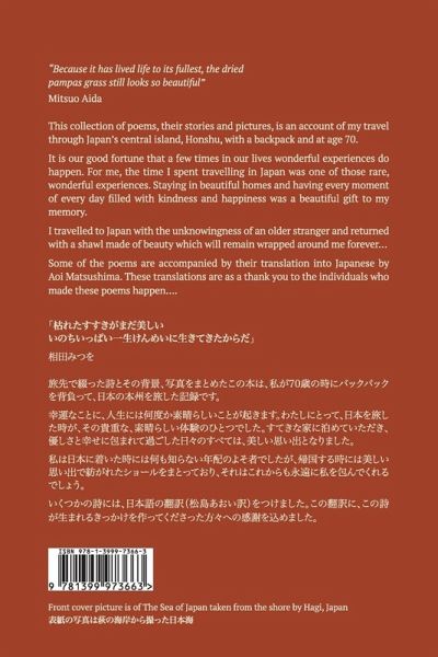 "Because it has lived life to its fullest, the dried pampas grass still looks so beautiful" Mitsuo Aida This collection of poems, their stories and pictures, is an account of my travel through Japan's central island, Honshu, with a backpack and at age 70. It is our good fortune that a few times in our lives wonderful experiences do happen. For me, the time I spent travelling in Japan was one of those rare, wonderful experiences. Staying in beautiful homes and having every moment of every day filled with kindness and happiness was a beautiful gift to my memory. I travelled to Japan with the unknowingness of an older stranger and returned with a shawl made of beauty which will remain wrapped around me forever. Some of the poems are accompanied by their translation into Japanese by Aoi Matsushima. These translations are as a thank you to the individuals who made these poems happen.