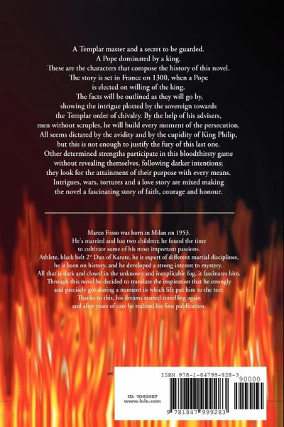 A Templar master and a secret to be guarded. A Pope dominated by a king. These are the characters that compose the history of this novel. The story is set in France on 1300, when a Pope is elected on willing of the king. The facts will be outlined as they will go by, showing the intrigue plotted by the sovereign towards the Templar order of chivalry. By the help of his advisers, men without scruples, he will build every moment of the persecution. All seems dictated by the avidity and by the cupidity of King Philip, but this is not enough to justify the fury of this last one. Other determined strengths participate in this bloodthirsty game without revealing themselves, following darker intentions; they look for the attainment of their purpose with every means. Intrigues, wars, tortures and a love story are mixed making the novel a fascinating story of faith, courage and honour.