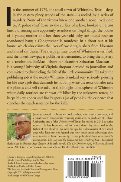 Based on TRUE CRIME, Jar of Pennies follows the story of how a murderer was brought to justice in small town east Texas. A book as much about east Texas culture deep in the pine forests of the state as it is about a chain of murders and the gathering of evidence, this riveting narrative has elements of both humor and noir as it rockets to its conclusion. East Texas is a land without horizons, every view obstructed by a great pine curtain that conceals both great beauty and great danger in its shadows, and the insular human cultures scattered through its fifty thousand square miles struggle to create what passes for civilization. Like the forests, human culture also has its dark recesses where lethality lies hidden, waiting for the moment or the opportunity. Madness, ignorance, and meanness forever dash against friendship, thoughtfulness, and camaraderie. And meanwhile, some people are still fighting the Civil War or seeking to become feudal lords. All of these struggles figure into the tapestry of the story, which is so much more than a tale of murder. Based on the actual murder of a young wife and her three-year old toddler, Jar of Pennies was the result of John Yearwood's decades of study of the east Texas culture and character.