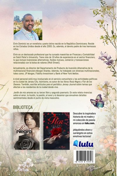 Embárcate en un viaje emocional a través de "Jardín de mis Amores," una obra poética cautivadora de Elvin Dominici que captura la esencia del amor en todas sus facetas. Dividido en cuatro estaciones, cada sección refleja la evolución del romance y el deseo, llevando al lector desde la frescura de la primavera hasta la intensidad del verano, la reflexión del otoño y la melancolía del invierno. Con un lenguaje lírico y evocador, Dominici utiliza imágenes vibrantes que pintan cuadros de amor, lujuria y vulnerabilidad. Desde el apasionado poema "36 Horas" hasta la profunda reflexión en "Blanco y Negro," cada verso es un testimonio de la experiencia humana, diseñado para resonar en el corazón de los lectores y evocar sus propios recuerdos de amor y anhelo. ¿Por qué leer "Jardín de mis Amores"? Conexión Emocional: Este libro no solo es poesía; es un espejo de las emociones que todos experimentamos. Los lectores encontrarán en sus páginas un reflejo de sus propios deseos y pérdidas, creando una conexión íntima con el texto. Ilustraciones Cautivadoras: Cada poema está acompañado por ilustraciones que enriquecen la experiencia de lectura, proporcionando una dimensión visual que complementa la lírica. Celebración de la Vulnerabilidad: La obra aborda la belleza y el dolor de las relaciones humanas, haciendo que sea perfecta para aquellos que buscan comprender el amor en toda su complejidad. Este poemario ha sido dedicado a la memoria de René Rodríguez Soriano, un mentor influyente en la vida de Dominici, lo que añade una capa de profundidad personal y autenticidad a cada palabra. "Jardín de mis Amores" es un tributo a la poesía como vehículo para la sanación y la conexión. Ideal para amantes de la poesía, coleccionistas y aquellos que buscan inspiración, este libro es una adición esencial a cualquier biblioteca personal. Disponible en Lulu y otras plataformas, permite a los lectores sumergirse en un mundo donde las palabras florecen como flores en un jardín, cada una con su propia historia de amor que contar. ¡Hazte un regalo a ti mismo o sorprende a un ser querido con esta joya poética! Adquiere "Jardín de mis Amores" hoy y deja que el poder del amor y la pasión transformen tus días.