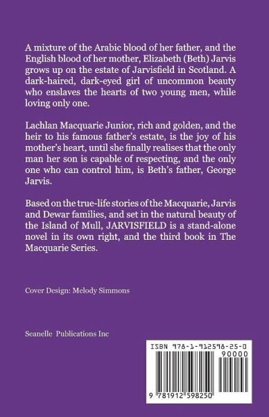 FROM THE INTERNATIONALLY PUBLISHED & BESTSELLING AUTHOR OF "TREAD SOFTLY ON MY DREAMS"A STAND ALONE NOVEL - and Book 3 of The Macquarie Series. A mixture of the Arabic blood of her father, and the English blood of her mother, Elizabeth (Beth) Jarvis grows up on the estate of Jarvisfield in Scotland. A dark-haired, dark-eyed girl of uncommon beauty who enslaves the hearts of two young men, while loving only one.Lachlan Macquarie Junior, rich and golden, and the heir to his famous father's estate, is the joy of his mother's heart, until she finally realises that the only man her son is capable of respecting, and the only one who can control him, is Beth's father, George Jarvis. Based on the true-life stories of the Macquarie, Jarvis and Dewar families, and set in the natural beauty of the Island of Mull, JARVISFIELD is a stand-alone novel in its own right, and the third book in The Macquarie Series.