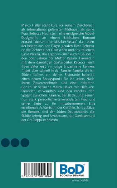 Marco Haller steht kurz vor seinem Durchbruch als international gefeierter Bildhauer, als seine Frau, Rebecca Haunstein, eine erfolgreiche Möbel-Designerin, an einem klinischen Burnout erkrankt, dessen dramatischer Verlauf das Leben der beiden aus den Fugen geraten lässt. Rebecca ist die Tochter einer Deutschen und des Italieners Lucio Panella, das Ergebnis einer kurzen Liaison in den 60er Jahren der Mutter Regina Haunstein mit dem damaligen Gastarbeiter. Rebecca lernt ihren Vater erst als junge Erwachsene kennen, findet aber schnell in der Familie Panella, die im Süden Italiens ein kleines Ristorante betreibt, einen neuen Bezugspunkt für ihr Leben. Nach ihrem Zusammenbruch und einer riskanten Gehirn-OP versucht Marco Haller mit Hilfe von Freunden, Verwandten und den Panellas den Spagat zwischen Karriere, der Betreuung seiner nun stark persönlichkeits- veränderten Frau und seiner Liebe zu ihr hinzubekommen. Eine emotionale Achterbahn der Gefühle. Schauplätze des Romans sind der Süden Deutschlands, die Städte Leipzig und Amsterdam, der Gardasee und der Ort Pioppi im Salento.