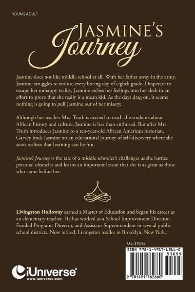 Jasmine does not like middle school at all. With her father away in the army, Jasmine struggles to endure every boring day of eighth grade. Desperate to escape her unhappy reality, Jasmine etches her feelings into her desk in an effort to prove that she really is a mean kid. As the days drag on, it seems nothing is going to pull Jasmine out of her misery. Although her teacher, Mrs. Truth, is excited to teach the students about African history and culture, Jasmine is less than enthused. But after Mrs. Truth introduces Jasmine to a ten-year-old African American historian, Garvey leads Jasmine on an educational journey of self-discovery where she soon realizes that learning can be fun. Jasmine's Journey is the tale of a middle schooler's challenges as she battles personal obstacles and learns an important lesson that she is as great as those who came before her.
