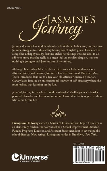 Jasmine does not like middle school at all. With her father away in the army, Jasmine struggles to endure every boring day of eighth grade. Desperate to escape her unhappy reality, Jasmine etches her feelings into her desk in an effort to prove that she really is a mean kid. As the days drag on, it seems nothing is going to pull Jasmine out of her misery. Although her teacher, Mrs. Truth, is excited to teach the students about African history and culture, Jasmine is less than enthused. But after Mrs. Truth introduces Jasmine to a ten-year-old African American historian, Garvey leads Jasmine on an educational journey of self-discovery where she soon realizes that learning can be fun. Jasmine's Journey is the tale of a middle schooler's challenges as she battles personal obstacles and learns an important lesson that she is as great as those who came before her.