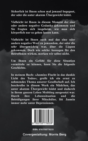 Sicherlich ist Ihnen schon mal jemand begegnet, der oder die unter akutem Übergewicht leidet.Vielleicht ist Ihnen in diesem Moment der eine oder andere negative Gedanke gekommen und Sie fragten sich insgeheim, wie man sich körperlich nur so gehen lassen kann.Vielleicht ist Ihnen auch mal das eine oder andere negative Wort zu jemandem, der oder die sehr übergewichtig war, über die Lippen gekommen. Doch wie solche Aussagen für den Betroffenen wirken, merken wir selbst nicht.Um Ihnen ein Gefühl für diese Situation vermitteln zu können, lesen Sie die folgende Geschichte.In meinem Buch: »Jasmins Flucht in das dunkle Licht des Todes«, greife ich ein ernst zu nehmendes Thema unserer Gesellschaft auf. Ich beschreibe in diesem Werk ein Mädchen, das unter akutem Übergewicht leidet und dadurch in ihrem ganzen Leben Mobbing ausgesetzt war. Durch ihre Lebenssituation und die Beleidigungen ihrer Mitschüler, litt Jasmin immer mehr unter Depressionen.
