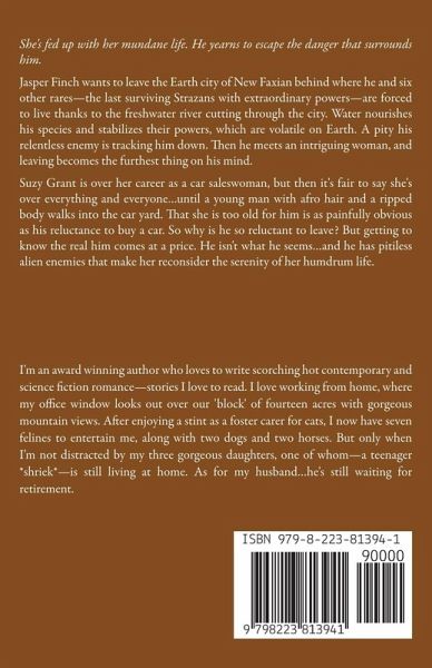 She's fed up with her mundane life. He yearns to escape the danger that surrounds him. Jasper Finch wants to leave the Earth city of New Faxian behind where he and six other rares-the last surviving Strazans with extraordinary powers-are forced to live thanks to the freshwater river cutting through the city. Water nourishes his species and stabilizes their powers, which are volatile on Earth. A pity his relentless enemy is tracking him down. Then he meets an intriguing woman, and leaving becomes the furthest thing on his mind. Suzy Grant is over her career as a car saleswoman, but then it's fair to say she's over everything and everyone...until a young man with afro hair and a ripped body walks into the car yard. That she is too old for him is as painfully obvious as his reluctance to buy a car. So why is he so reluctant to leave? But getting to know the real him comes at a price. He isn't what he seems...and he has pitiless alien enemies that make her reconsider the serenity of her humdrum life.
