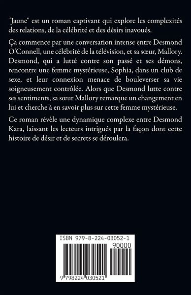 "Jaune" est un roman captivant qui explore les complexités des relations, de la célébrité et des désirs inavoués. Ça commence par une conversation intense entre Desmond O'Connell, une célébrité de la télévision, et sa s¿ur, Mallory. Desmond, qui a lutté contre son passé et ses démons, rencontre une femme mystérieuse, Sophia, dans un club de sexe, et leur connexion menace de bouleverser sa vie soigneusement contrôlée. Alors que Desmond lutte contre ses sentiments, sa s¿ur Mallory remarque un changement en lui et cherche à en savoir plus sur cette femme mystérieuse. Ce roman révèle une dynamique complexe entre Desmond Kara, laissant les lecteurs intrigués par la façon dont cette histoire de désir et de secrets se déroulera.
