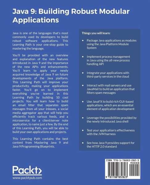 Mastering advanced features of Java and implement them to build amazing projects Key Features: - Take advantage of Java's new modularity features to write real-world applications that solve a variety of problems - Explore the major concepts introduced with Java 9, including modular programming, HTTP 2.0, API changes, and more - Get to grips with tools, techniques and best practices to enhance application development Book Description: Java 9 and its new features add to the richness of the language; Java is one of the languages most used by developers to build robust software applications. Java 9 comes with a special emphasis on modularity with its integration with Jigsaw. This course is your one-stop guide to mastering the language. You'll be provided with an overview and explanation of the new features introduced in Java 9 and the importance of the new APIs and enhancements. Some new features of Java 9 are ground-breaking; if you are an experienced programmer, you will be able to make your enterprise applications leaner by learning these new features. You'll be provided with practical guidance in applying your newly acquired knowledge of Java 9 and further information on future developments of the Java platform. This course will improve your productivity, making your applications faster. Next, you'll go on to implement everything you've learned by building 10 cool projects. You will learn to build an email filter that separates spam messages from all your inboxes, a social media aggregator app that will help you efficiently track various feeds, and a microservice for a client/server note application, to name just a few. By the end of this course, you will be well acquainted with Java 9 features and able to build your own applications and projects. This Learning Path contains the best content from the following two recently published Packt products: - Mastering Java 9 - Java 9 Programming Blueprints What You Will Learn: - Package Java applications as modules using the Java Platform Module System - Implement process management in Java using the all-new process handling API - Integrate your applications with third-party services in the cloud - Interact with mail servers, using JavaMail to build an application that filters spam messages - Use JavaFX to build rich GUI-based applications, which are an essential element of application development - Leverage the possibilities provided by the newly introduced Java shell - Test your application s effectiveness with the JVM harness - See how Java 9 provides support for the HTTP 2.0 standard Who this book is for: This learning path is for Java developers who are looking to move a level up and learn how to build robust applications in the latest version of Java.