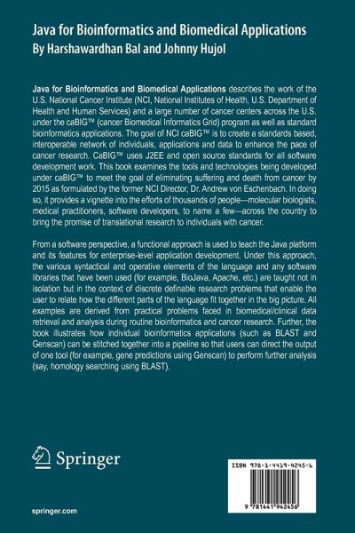 April 2006 Introduction Bioinformatics is at a crossroads. We work in a field that is changing every day, increasingly moving from specific solutions created by single researchers working alone or in small groups to larger, often geographically dispersed programs enabled by collaborative computing and open software. This book represents an important development, giving the reader an opportunity to discover how the use of open and reusable Java code can solve large bioinformatics problems in a software engineered and robust way. I work with one of the authors of this book every day, on the National Cancer Institute's cancer Biomedical Informatics Grid (caBIG(TM)) project, and I can attest that they are well suited to share with their readers both their experience in the development and use of bioinformatics software, as well as their interest in solid software engineering and interoperability. Background and history In its short history, bioinformatics has become an increasingly important part of how scientists involved in biological research go about their work. This has lead to an explosion of interest in the subject, and a similar explosion in tools and data resources for researchers to learn and use in their work. Historically, tools for bioinformatics have been idiosyncratic and are custom-developed by the end-users (or those close to them) in an iterative fashion until the specific immediate problem is solved. This has led to a balkanization of informatics systems, sometimes yielding multiple, incompatible systems at a single institution for a single application.