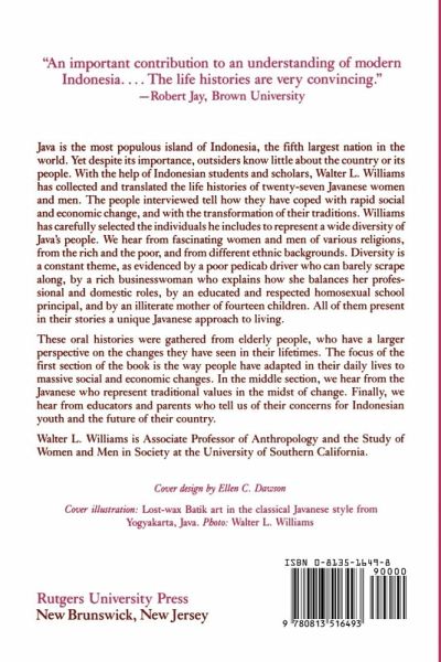 Java is the most populous island of Indonesia, the fifth largest nation in the world. Yet despite its importance, outsiders know little about the country or its people. With the help of Indonesian students and scholars, Walter L. Williams has collected and translated the life histories of twenty-seven Javanese women and men. The people interviewed tell how they have coped with rapid social and economic change, and with the transformation of their traditions. Williams has carefully selected the individuals he includes to represent a wide diversity of Java's people. We hear from fascinating women and men of various religions, from the rich and the poor, and from different ethnic backgrounds. Diversity is a constant theme, as evidenced by a poor pedicab driver who can barely scrape along, by a rich businesswoman who explains how she balances her professional domestic roles, by an educated and respected homosexual school principal, and by an illiterate mother of fourteen children. All of them present in their stories a unique Javanese approach to living.These oral histories were gathered from elderly people, who have a larger perspective on the changes they have seen in their lifetimes. The focus of the first section of the book is the way people have adapted in their daily lives massive social and economic changes. In the middle section, we hear from the Javanese who represent traditional values in the midst of change. Finally, we hear from educators and parents who tell us of their concerns for Indonesian youth and the future of the country.Walter L. Williams is an associate professor of anthropology and the study of women and men in society at the University of Southern California.