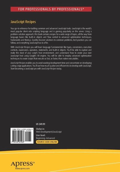 With JavaScript Recipes you will learn language fundamentals like types, conversions, execution contexts, expressions, operators, statements, and built-in objects. You'll explore and make the most of your script's host environment and how to create your own JavaScript host using Google's V8 engine. Employ advanced optimization techniques to create scripts that execute as fast, or faster, than native executables.