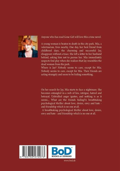 Anyone who has read Gone Girl will love this crime novel.A young woman is beaten to death in the city park. Mia, a veterinarian, lives nearby. One day, her best friend from childhood days, the charming and successful Jay, disappears without a trace. She left a letter to her husband behind, asking him not to pursue her. Mia immediately suspects foul play when she realizes that Jay resembles the dead woman from the park. Where is Jay? Nobody seems to care, except for Mia. Their friends are acting strangely and seem to be hiding something. On her search for Jay, Mia starts to face a nightmare. She becomes entangled in a web of lies, intrigue, hatred and betrayal. Unbridled anger ignites, and nothing is as it seems... What are the friends hiding?A breathtaking psychological thriller about love, desire, envy and hate - and friendship which is no one at all.