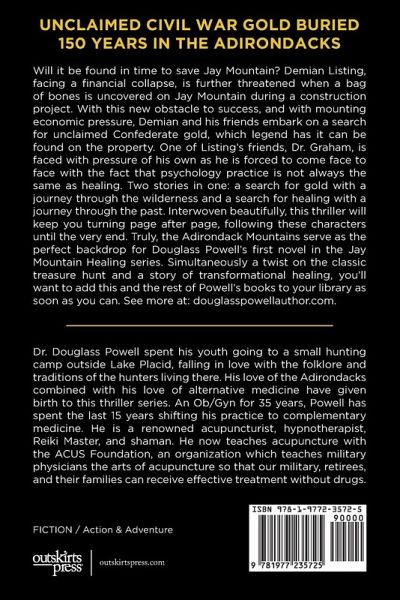 Demian Listing, facing a financial collapse, is further threatened when a bag of bones is uncovered on Jay Mountain during a construction project. This raises the potential for a protracted court case and may cause his empire to fail completely. With this new obstacle to success, and with mounting economic pressure, Demian and his friends embark on a search for unclaimed Confederate gold, which legend has it can be found on the property. One of Listing's friends, Dr. Graham, is faced with pressure of his own, as he is forced to come face to face with the fact that psychology is not always the same as healing. Dr. Crandall needs to find solace after suffering PTSD from a protracted court case that has taken everything from him. Both these men are helped by a young woman who performs Reiki and heals their wounds. Two stories in one: a search for gold with a journey through the wilderness and a search for healing with a journey through the past. Interwoven beautifully, this thriller will keep you turning page after page, following these characters until the very end. Truly, the Adirondack Mountains serve as the Perfect backdrop for Douglass Powell's novel, the first in the Jay Mountain Healing Series. Simultaneously a twist on the classic treasure hunt and a story of transformational healing, you'll want to add this and the rest of Powell's books to your library now.