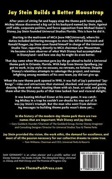 Jay Stein Builds a Better Mousetrap After years of sitting fat and happy atop the theme park totem pole, Mickey Mouse discovered a big cat in his backyard named Jay Stein. Against stiff odds, corporate politics, and fierce opposition from Michael Eisner's Disney, Jay Stein founded Universal Studios Florida. This is how he did it. Starting in the mailroom of MCA (now NBCUniversal), where his duties included delivering messages to stars like Alfred Hitchcock and Ronald Reagan, Jay Stein soon found himself in charge of the Universal Studio Tour, reporting directly to MCA chairman Lew Wasserman. He became a keen observer of what Walt Disney had accomplished in Disneyland-and how one day he might do even better. That day came when Wasserman gave Jay the go-ahead to build a Universal theme park in Orlando, Florida. With help from Steven Spielberg, Jay got to work, in Jay style: no excuses, no retreats, no failures. Despite Disney's relentless attempts to sabotage the project, and ruinous infighting among members of his own team, Jay did not give up. When the new theme park opened in 1990, it was full of Jay's patented "JayBangs"-rides and attractions that stunned, shocked, and surprised guests, dousing them with water, blasting them with air, heat, or cold, and giving them what the Disney parks of that time lacked: fear and visceral delight. It was beating Michael Eisner at his own game. It was catching Mickey in a trap he couldn't aw-shucks his way out of. It was Jay Stein's triumph. But the man who went from delivering messages to building theme parks wasn't done yet...