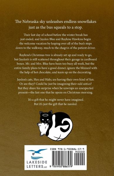 The Nebraska sky unleashes endless snowflakes just as the bus squeals to a stop. Their last day of school before the winter break has just ended, and Jayden Blue and Raylene Hawkins begin the welcome vacation by leaping over all of the bus's steps down to the walkway, much to the chagrin of the patient driver. Raylene's Christmas tree is already set up and ready to go, but Jayden's is still scattered throughout their garage in cardboard boxes. Mr. and Mrs. Blue have been too busy all week, but the entire family plans to have a good dinner, ignore the blizzard with the help of hot chocolate, and team up on the decorating. Jayden's cats, Hex and Halo, are having their own kind of fun. Or are they? Could he just be imagining their odd antics? But they share his surprise when he unwraps an unexpected present-the last one that he opens on Christmas morning. It's a gift that he might never have imagined. But it's just the gift that he needed.