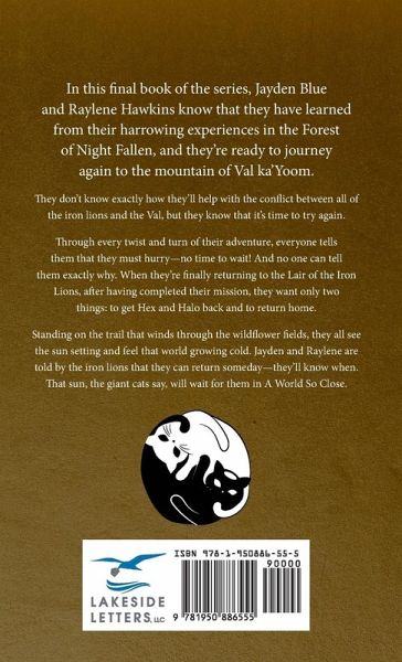 In this final book of the series, Jayden Blue and Raylene Hawkins know that they have learned from their harrowing experiences in the Forest of Night Fallen, and they're ready to journey again to the mountain of Val ka'Yoom. They don't know exactly how they'll help with the conflict between all of the iron lions and the Val, but they know that it's time to try again. Through every twist and turn of their adventure, everyone tells them that they must hurry-no time to wait! And no one can tell them exactly why. When they're finally returning to the Lair of the Iron Lions, after having completed their mission, they want only two things: to get Hex and Halo back and to return home. Standing on the trail that winds through the wildflower fields, they all see the sun setting and feel that world growing cold. Jayden and Raylene are told by the iron lions that they can return someday-they'll know when. That sun, the giant cats say, will wait for them in A World So Close.
