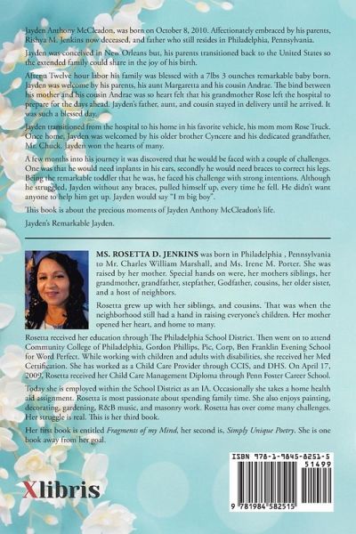 Jayden Anthony McCleadon, was born on October 8, 2010. Affectionately embraced by his parents, Rishya M. Jenkins now deceased, and father who still resides in Philadelphia, Pennsylvania. Jayden was conceived in New Orleans but, his parents transitioned back to the United States so the extended family could share in the joy of his birth. After a Twelve hour labor his family was blessed with a 7lbs 3 ounches remarkable baby born. Jayden was welcome by his parents, his aunt Margaretta and his cousin Andrae. The bind between his mother and his cousin Andrae was so heart felt that his grandmother Rose left the hospital to prepare for the days ahead. Jayden's father, aunt, and cousin stayed in delivery until he arrived. It was such a blessed day. Jayden transitioned from the hospital to his home in his favorite vehicle, his mom mom Rose Truck. Once home, Jayden was welcomed by his older brother Cyncere and his dedicated grandfather, Mr. Chuck. Jayden won the hearts of many. A few months into his journey it was discovered that he would be faced with a couple of challenges. One was that he would need inplants in his ears, secondly he would need braces to correct his legs. Being the remarkable toddler that he was, he faced his challenge with strong intentions. Although he struggled, Jayden without any braces, pulled himself up, every time he fell. He didn't want anyone to help him get up. Jayden would say "I m big boy". This book is about the precious moments of Jayden Anthony McCleadon' s life. Jayden's Remarkable Jayden.