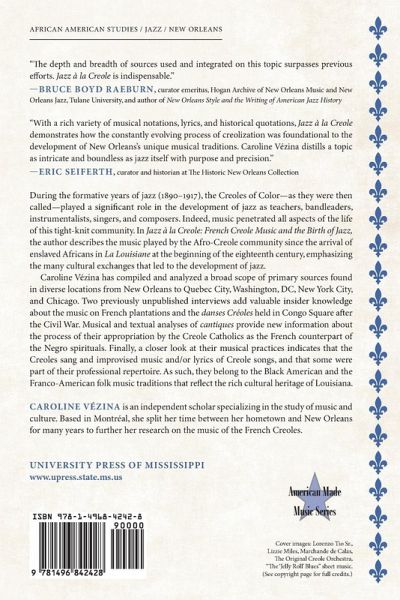 During the formative years of jazz (1890-1917), the Creoles of Color--as they were then called--played a significant role in the development of jazz as teachers, bandleaders, instrumentalists, singers, and composers. Indeed, music penetrated all aspects of the life of this tight-knit community, proud of its French heritage and language. They played and/or sang classical, military, and dance music as well as popular songs and cantiques that incorporated African, European, and Caribbean elements decades before early jazz appeared. In Jazz à la Creole: French Creole Music and the Birth of Jazz, the author describes the music played by the Afro-Creole community since the arrival of enslaved Africans in La Louisiane, then a French colony, at the beginning of the eighteenth century, emphasizing the many cultural exchanges that led to the development of jazz. Caroline Vézina has compiled and analyzed a broad scope of primary sources found in diverse locations from New Orleans to Quebec City, Washington, DC, New York City, and Chicago. Two previously unpublished interviews add valuable insider knowledge about the music on French plantations and the danses Créoles held in Congo Square after the Civil War. Musical and textual analyses of cantiques provide new information about the process of their appropriation by the Creole Catholics as the French counterpart of the Negro spirituals. Finally, a closer look at their musical practices indicates that the Creoles sang and improvised music and/or lyrics of Creole songs, and that some were part of their professional repertoire. As such, they belong to the Black American and the Franco-American folk music traditions that reflect the rich cultural heritage of Louisiana.