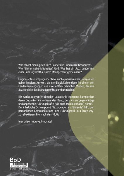 Was macht einen guten Jazz-Leader aus - und auch "besonders"? Wie führt er seine Mitstreiter? Und: Was hat ein Jazz-Leader mit einer Führungskraft aus dem Management gemeinsam?Original-Zitate stilprägender bzw. einflussreicher Jazzgrößen geben darauf insofern Antwort, als sie die vielschichtigen Parallelen von Leadership-Zugängen aus zwei gänzlich unterschiedlichen Welten, der des Jazz und der des Managements, sichtbar machen.Ein Abriss relevanter aktueller Leadership-Konzepte komplettiert deren Gedanken im vorliegenden Band, der sich an gegenwärtige und angehende Führungskräfte (wie auch Musikliebhaber) richtet. Der inhaltliche Schwerpunkt "Jazz-Leader als Führende" bietet sich an, den persönlichen Kommunikations- und Führungsstil "in a jazzy way" zu reflektieren. Frei nach dem Motto: Improvise, Improve, Innovate!