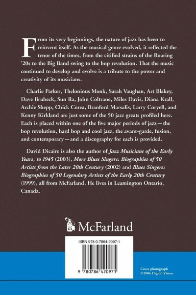 From its very beginnings, the nature of jazz has been to reinvent itself. As the musical genre evolved from its roots--blues, European music, Voodoo ceremonies, and brass bands that played at funerals, parades and celebrations--the sound reflected the tenor of the times, from the citified strains of the Roaring '20s to the Big Band swing of pre-World War II to the bop revolution that grew out of the minimalist sound the war forced upon the art form. That the music continued to develop and evolve is a tribute to the power and creativity of its musicians. Charlie Parker, Thelonious Monk, Sarah Vaughan, Art Blakey, Dave Brubeck, Sun Ra, John Coltrane, Miles Davis, Diana Krall, Archie Shepp, Chick Corea, Branford Marsalis, Larry Coryell, and Kenny Kirkland are just some of the jazz greats profiled here. The five major periods of jazz--the bop revolution, hard bop and cool jazz, the avant-garde, fusion, and contemporary--form the basis for the sections in this reference work, with a brief history of each period provided. The artists who were integral to the evolution of each period are then profiled. Each biographical entry focuses on the artist's life and his or her influence on jazz and on music as a whole. A complete discography for each musician is also provided.