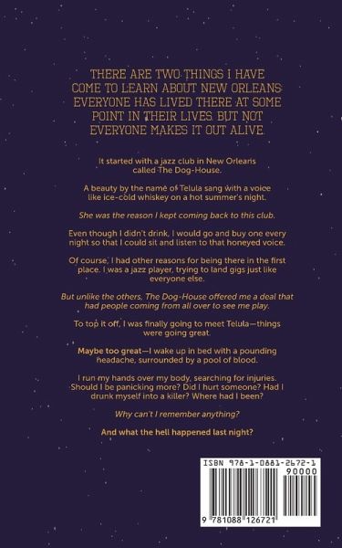 There are two things I have come to learn about New Orleans: Everyone has lived there at some point in their lives. But not everyone makes it out alive. It started with a jazz club in New Orleans called The Dog-House. A beauty by the name of Telula sang with a voice like ice-cold whiskey on a hot summer's night. She was the reason I kept coming back to this club. Even though I didn't drink, I would go and buy one every night so that I could sit and listen to that honeyed voice. Of course, I had other reasons for being there in the first place. I was a jazz player, trying to land gigs just like everyone else. But unlike the others, The Dog-House offered me a deal that had people coming from all over to see me play. To top it off, I was finally going to meet Telula-things were going great. Maybe too great-I wake up in bed with a pounding headache, surrounded by a pool of blood. I run my hands over my body, searching for injuries. Should I be panicking more? Did I hurt someone? Had I drunk myself into a killer? Where had I been? Why can't I remember anything? And what the hell happened last night?