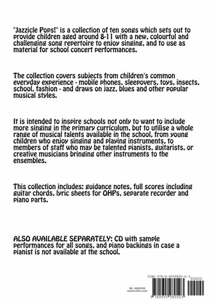 A collection of children's songs aimed at the 8-11 age range. The songs offer an inspiring, colourful and challenging song repertoire for children to enjoy, and to use as material for school concert performances. The collection covers subjects relating to children's common everyday experience - mobile phones, sleepovers, toys, insects, school, fashion - and draws on jazz, blues and other popular musical styles. It sets out to encourage schools to utilise a whole range of musical talents available, from young children who enjoy singing and playing instruments to members of staff who may be talented pianists, guitarists or creative musicians bringing other instruments to the ensemble. The book includes detailed guidance notes for each song, full scores, guitar chords, lyric sheets for the creation of OHP acetates, separate recorder and piano parts. An accompanying CD with sample performances of each song and full backings for all songs will shortly be available separately.