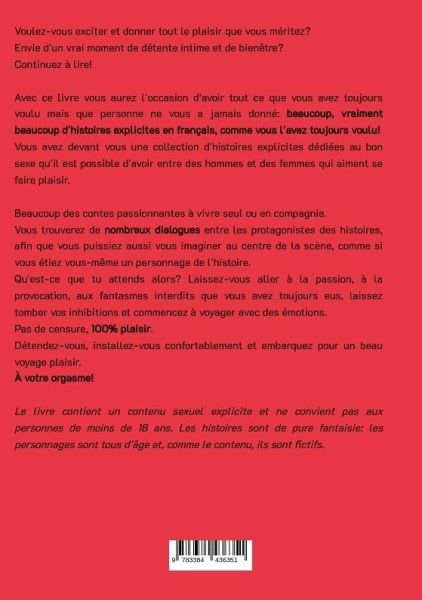 Voulez-vous exciter et donner tout le plaisir que vous méritez?Envie d'un vrai moment de détente intime et de bienêtre?Continuez à lire!Avec ce livre vous aurez l'occasion d'avoir tout ce que vous avez toujours voulu mais que personne ne vous a jamais donné: beaucoup, vraiment beaucoup d'histoires explicites en français, comme vous l'avez toujours voulu!Vous avez devant vous une collection d'histoires explicites dédiées au bon sexe qu'il est possible d'avoir entre des hommes et des femmes qui aiment se faire plaisir. Beaucoup des contes passionnantes à vivre seul ou en compagnie.Vous trouverez de nombreux dialogues entre les protagonistes des histoires, afin que vous puissiez aussi vous imaginer au centre de la scène, comme si vous étiez vous-même un personnage de l'histoire.Qu'est-ce que tu attends alors? Laissez-vous aller à la passion, à la provocation, aux fantasmes interdits que vous avez toujours eus, laissez tomber vos inhibitions et commencez à voyager avec des émotions.Pas de censure, 100 pour 100 de plaisir.Détendez-vous, installez-vous confortablement et embarquez pour un beau voyage plaisir.À votre orgasme!