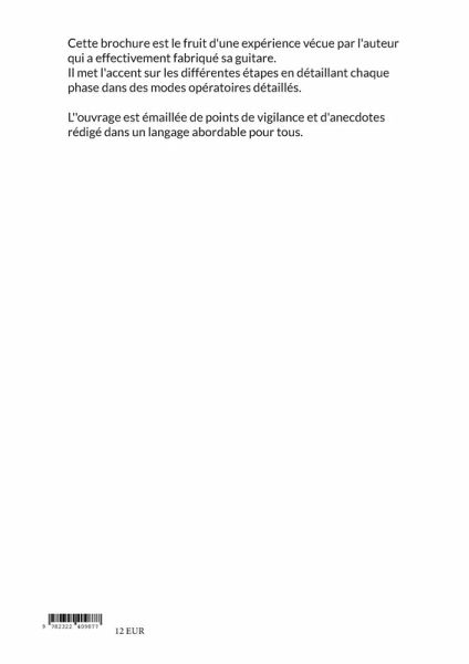 Cette brochure est le fruit d'une expérience vécue par l'auteur qui a effectivement fabriqué sa guitare.Il met l'accent sur les différentes étapes en détaillant chaque phase dans des modes opératoires détaillés. L''ouvrage est émaillée de points de vigilance et d'anecdotes rédigé dans un langage abordable pour tous.