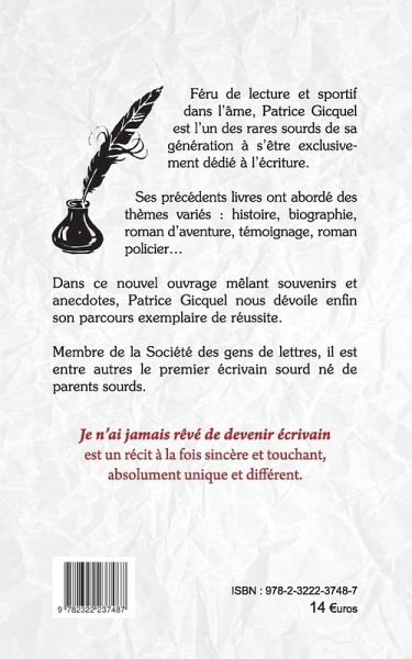 Féru de lecture et sportif dans l'âme, Patrice GICQUEL est l'un des rares sourds de sa génération à s'être exclusivement dédié à l'écriture.Ses précédents livres ont abordé des thèmes variés : histoire, biographie, roman d'aventure, témoignage, roman policier...Dans ce nouvel ouvrage mêlant souvenirs et anecdotes, Patrice GICQUEL nous dévoile enfin son parcours exemplaire de réussite.Membre de la Société des gens de lettres, il est entre autres le premier écrivain sourd né de parents sourds."Je n'ai jamais rêvé de devenir écrivain" est un récit à la fois sincère et touchant, absolument unique et différent.