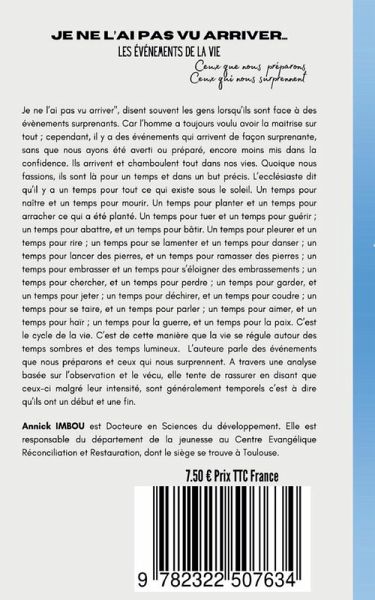 Je ne l'ai pas vu arriver, disent souvent les gens lorsqu'ils sont face à des événements surprenants. Car l'homme a toujours voulu avoir la maîtrise sur tout. Cependant, il y a des événements qui arrivent de façon surprenante, sans que nous ayons été averti ou préparé encore moins mis dans la confidence. Ils arrivent et chamboulent tout dans nos vies. Quoique nous fassions, ils sont sont là pour un temps et dans un but précis. L'ecclésiaste dit qu'il y a un temps pour tout ce qui existe sous le soleil. L'auteure parle des événements que nous préparons et ceux qui nous surprennent. a travers une analyse basée sur l'observation et le vécu, elle tente de rassurer en disant que ceux-ci malgré leur intensité sont généralement temporels c'est à dire qu'ils ont un début et une fin.